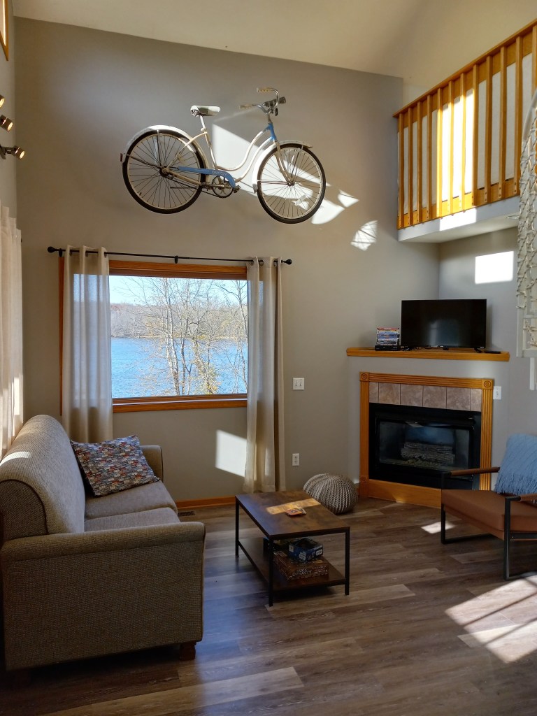 Sometimes people just want to burrow in someplace warm and cozy. Badger Digs sleeps 6 with a queen bed featuring a custom pine log headboard on the ground level. Climb the spiral staircase to the loft area with 2 full size beds and a separate work area for those people who can’t leave work behind. There’s a patio out front with a panoramic view of the river that will impress along with a complete kitchen and 2 full baths.