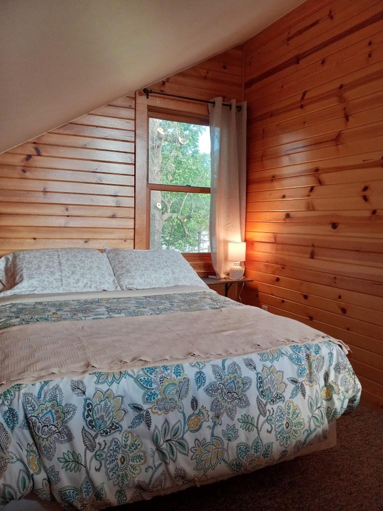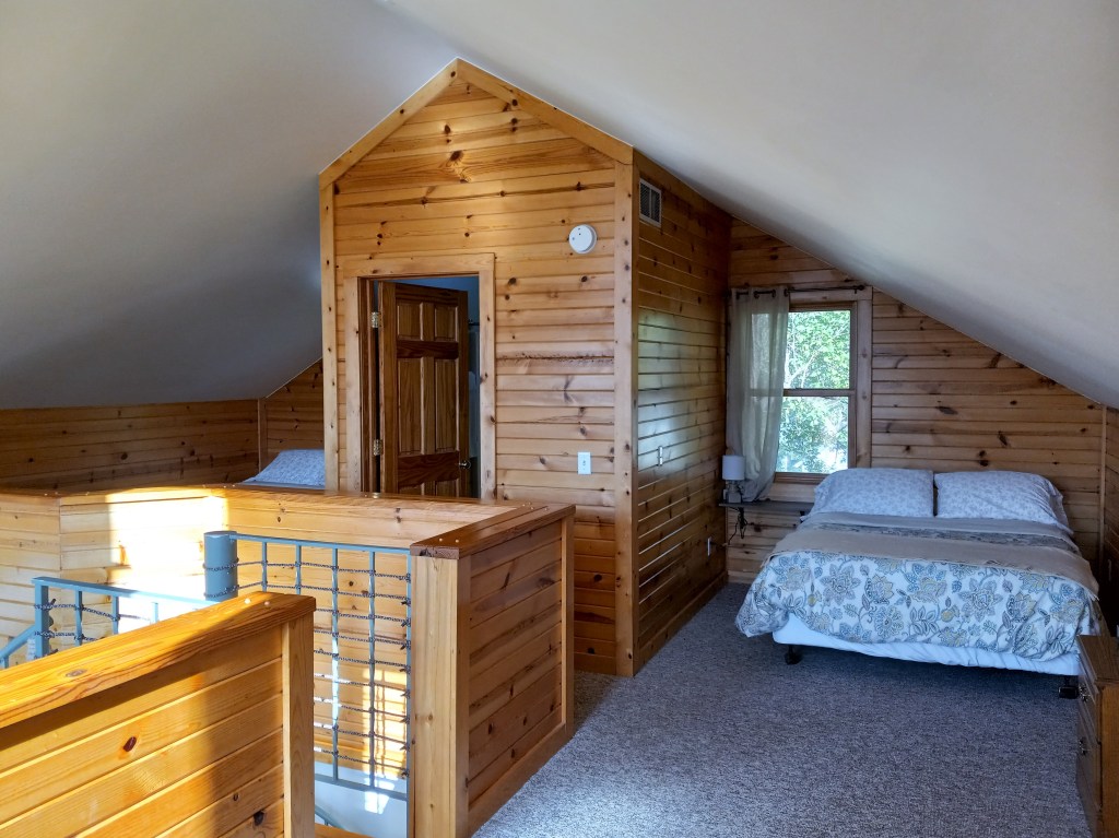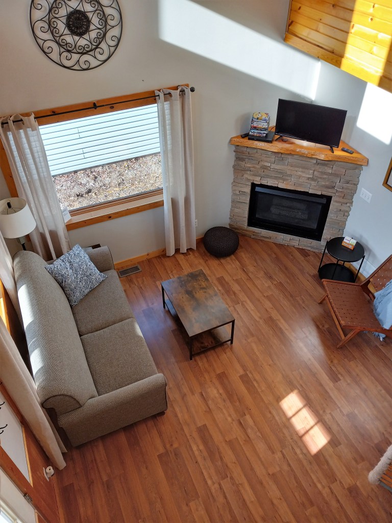 Bird’s eye view!Time for coffee?Gas fireplace for those cozy nightsCrisp cotton sheetsZzzzzz….Desk and play area in the loftSecond floor full bathSleeping area in the loftFull bed one…Wanna grill out? I’m hungry!Maybe check out the game area and..watch the fire or…Cabin tripletsExcept maybe an autumn sunrise