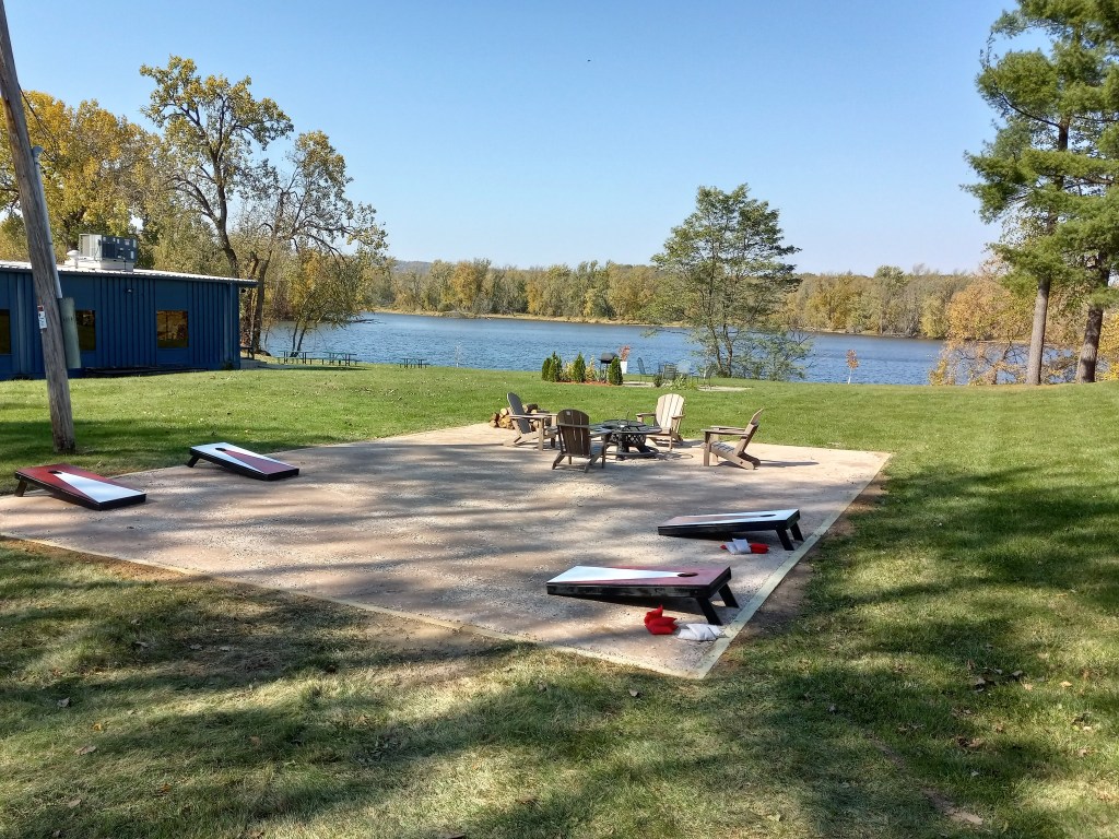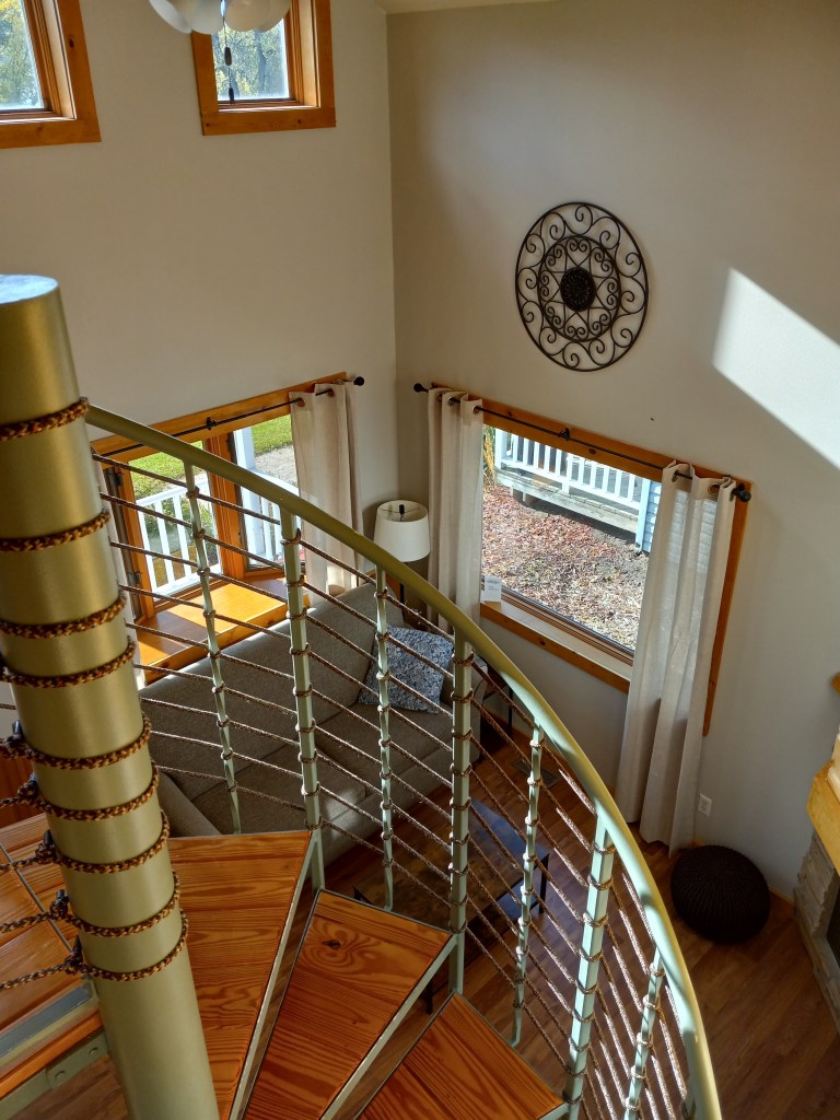 Full kitchen……with stainless steel and quartz!Living room from aboveFirst floor full bathNap time!Up the spiral staircase!Gorgeous vaulted ceilingSo clean!…and full bed twoOr maybe sit on the front porch?…play some cornholeSummer in Wisconsin..nothing better!Or a sunset over the Wisconsin River
